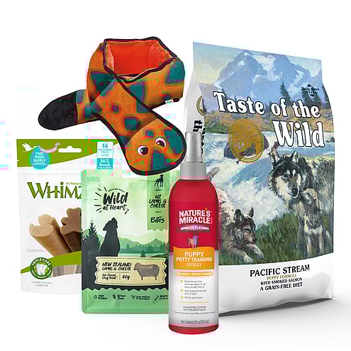 Taste of The Wild 2kg Puppy formula, Natures Miracle Puppy Potty Training Spray 236ml, Wild at Heart treat, Whimzees Puppy M/L Value Bag and Outward Hound Invincible Snake 6 Squeak Orange/Blue.